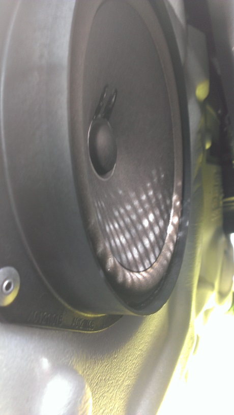 Wie auf dem Bild zu sehen, ist der Tieftöner mit der Tür vernietet. Diese Nieten habe ich aufgebohrt. Dann kam mir schon alles entgegen. Der Hochtöner hingegen ist nur in die Türverkleidung geclipst.