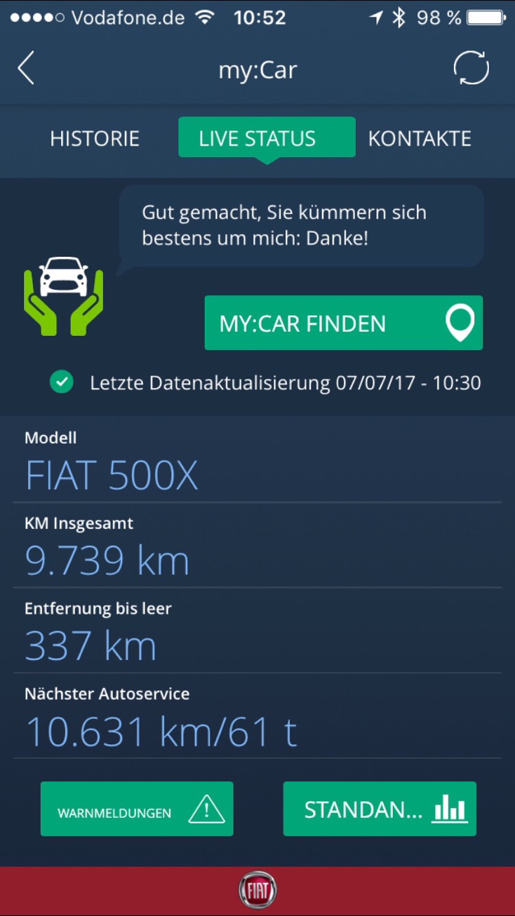 Hätte schon auf handy app installiert und online angemeldet...Nach dem Gespräch mit fiat hatte gekriegt Antwort daas die diese service nicht verfügbar in meine 500 Weill ist ex rental Fahrzeug..
