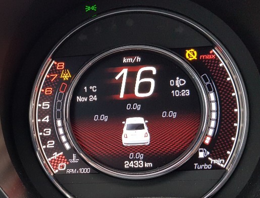 Ab und zu mal taucht bei mir in der Mitte des Tachos ein Fiat auf, der rechts, links, oben und unten jeweils 3 Nullen mit einem g daneben hat. Beim beschleunigen werden unten die g Kräfte angezeigt. Genauso beim Kurven fahren, oder verzögern.