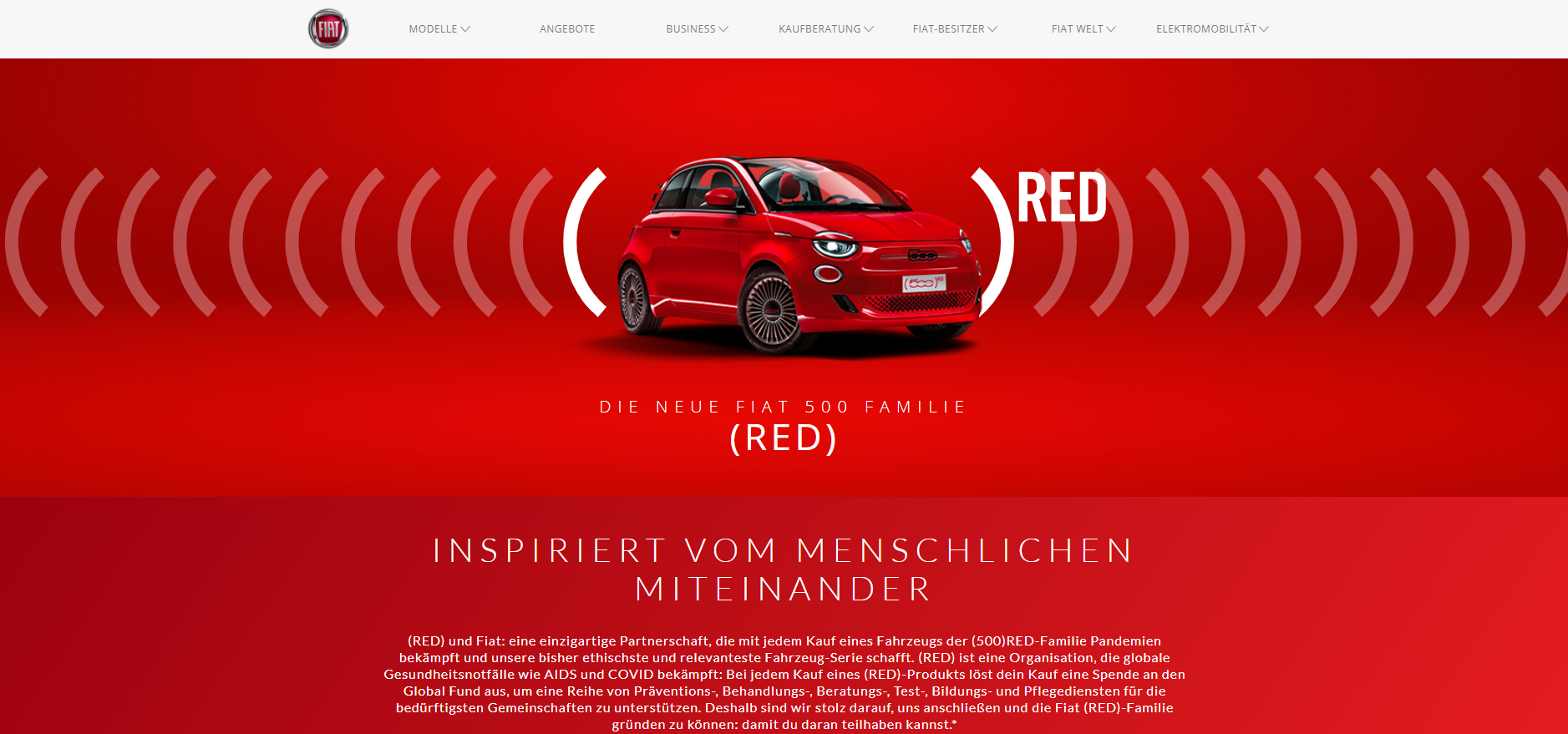 - Gemeinsam mit Jeep und RAM folgt FIAT mit (RED) dem Aufruf, den weltweiten Kampf gegen Pandemien durch die Einführung von (RED)-Sondermodellen zu unterstützen, dafür werden in den nächsten drei Jahren mehr als 4 Millionen Dollar bereitgestellt