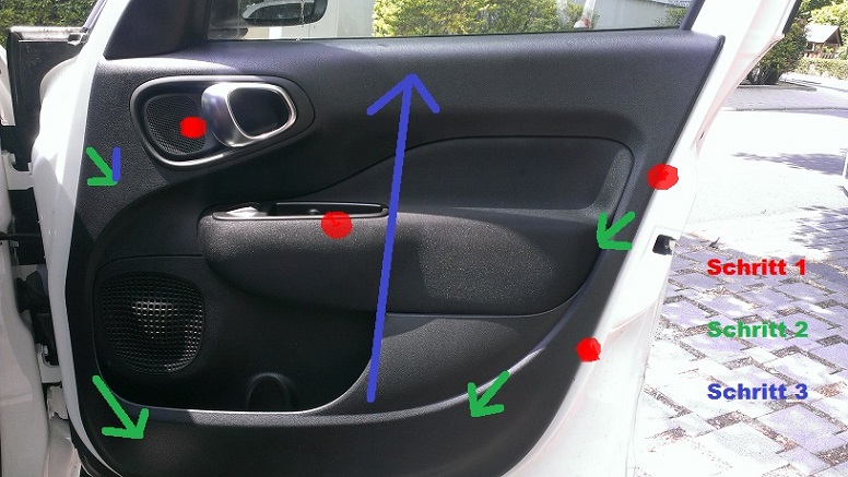 Schritt 2: Türverkleidung entklipsenDie Türverkleidung von unten (WICHTIG!!!) beginnend rückartig aber vorsichtig abziehen. Dann nach oben weiter lösen. Alle Clipse sind sehr stabil. Mir ist keiner Kaputt gegangen. Im Winter würde ich es trotzdem nicht empfehlen, da bei Kälte das Plaste evtl etwas steif und somit leicht zerbrechlich wird. Im Sommer klappts aber wunderbar!